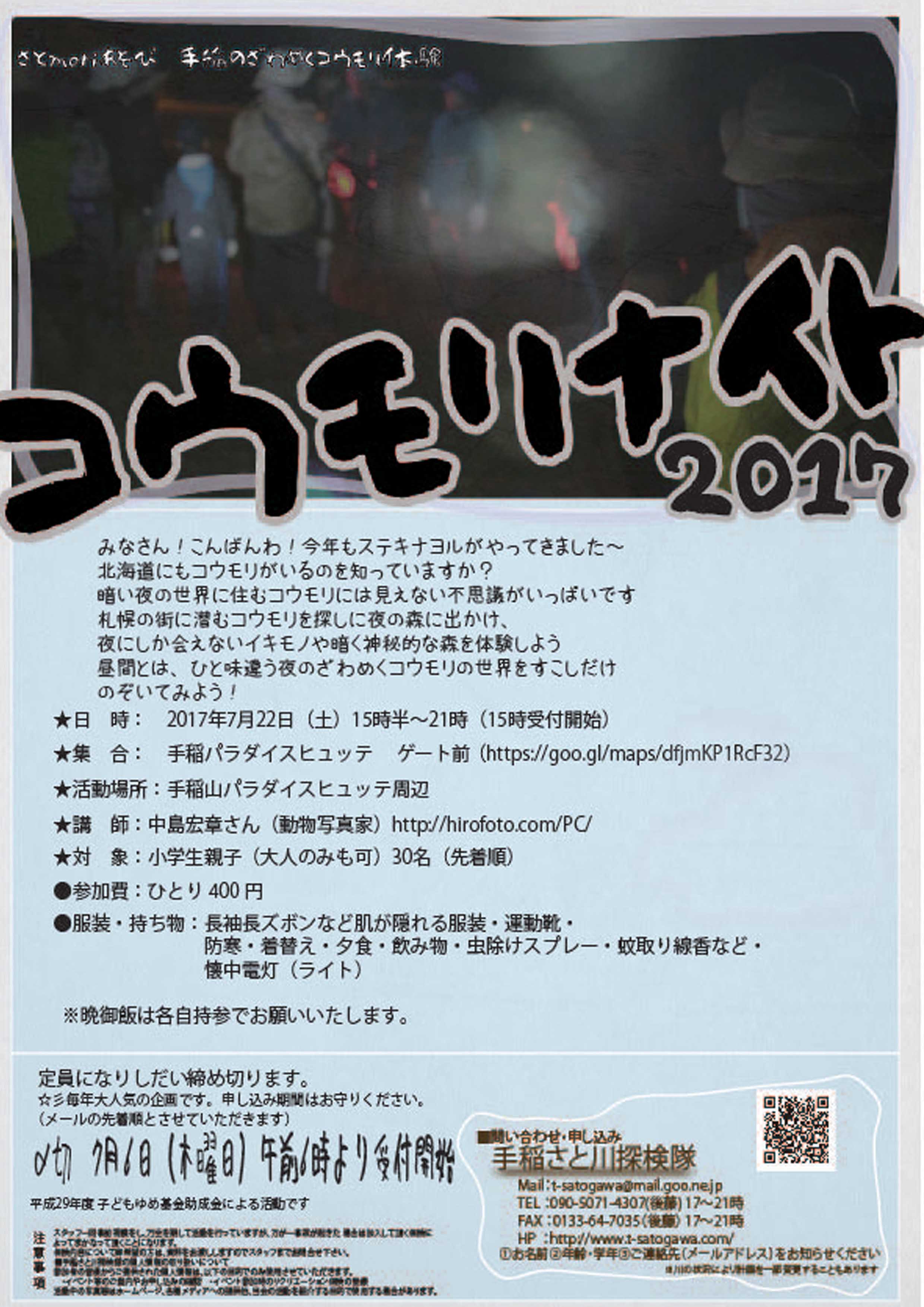みなさん!こんばんわ!今年もステキナヨルがやってきました~ 北海道にもコウモリがいるのを知っていますか? 暗い夜の世界に住むコウモリには見えない不思議がいっぱいです 札幌の街に潜むコウモリを探しに夜の森に出かけ、 夜にしか会えないイキモノや暗く神秘的な森を体験しよう 昼間とは、ひと味違う夜のざわめくコウモリの世界をすこしだけ のぞいてみよう! |